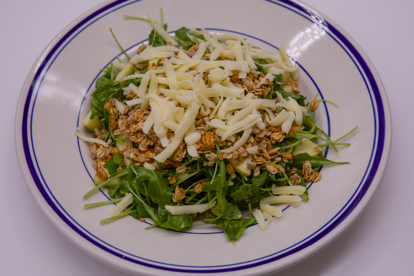 Arugula, sharp white cheddar, house-made granola, apple cider vinaigrette.