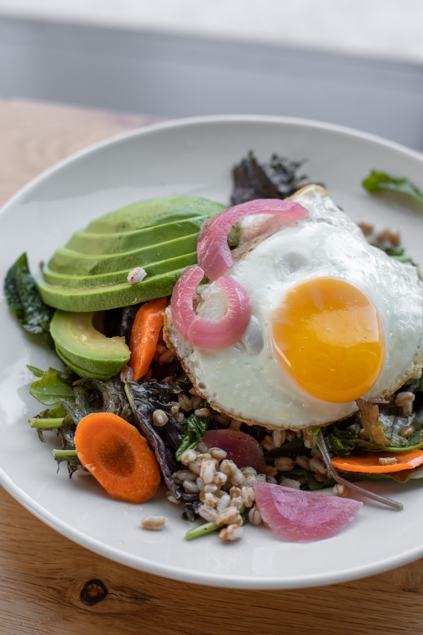 Farro, avocado, baby kale, shaved carrots, pickled red onions, lemon vinaigrette
